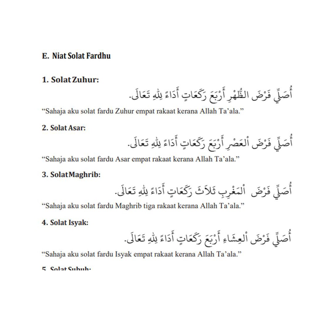 Niat dalam solat fardhu seperti solat subuh, zohor, asar, maghrib, isyak dan asar.