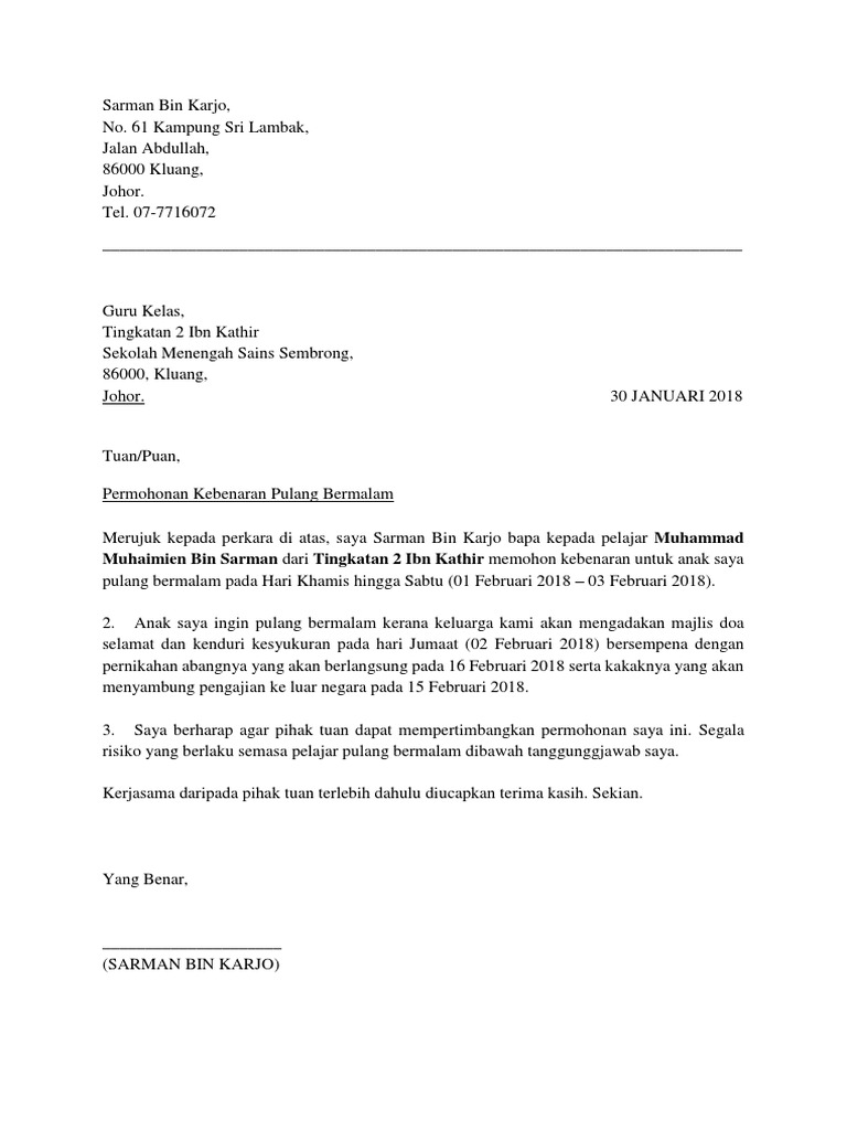 Surat juga seringkali dipergunakan oleh perseorangan yang ditujukan kepada suatu perkumpulan atau menyatakan ketidakhadiran, salah jika kamu sedang dalam keadaan sakit dan harus berobat ke dokter, maka hal tersebut bisa kamu jadikan sebagai alasan atau sebagai bukti kepada pihak sekolah. Terdapat beberapa sebab mengapa pelajar tidak dapat hadir, kerana balik kampung, sakit. Surat tidak hadir ke sekolah ditulis dengan format surat kiriman rasmi. Surat rasmi tunjuk sebab ketidakhadiran anak/ jagaan ke sekolah. Adalah saya merujuk kepada perkara diatas. Surat ini dikira juga sebagai surat untuk menunjukkan sebab mengapa tidak hadir sekolah. Surat ini bertujuan untuk memberitahukan pihak sekolah dalam hal ini guru atau wali kelas bahwa siswa yang namanya disebutkan dalam surat tersebut mendapatkan halangan untuk datang ke sekolah. Ketidakhadiran ke sekolah atas urusan keluarga seperti kematian atau sebagainya: Surat rasmi permohonan cuti sekolah ini penting dalam memastikan rekod ketidakhadiran pelajar dapat dibuktikan dengan surat ini dan tidak ditanda sebagai ponteng sekolah. Hadir ke sekolah disebabkan, menghantar surat, nama anak, hadir ke sekolah atas, untuk menulis surat, satu kesalahan, atas urusan kematian, ketidakhadiran ke sekolah, contoh surat tidak hadir, balik kampung, surat cuti. 70, jalan mega jaya 1 sekiranya pihak sekolah ada sebarang pertanyaan berkaitan ketidakhadiran anak saya, boleh hubungi saya di <no.fon waris> bagi mendapatkan kepastian. Sertakan perkataan terima kasih sebagai satu budi bahasa dengan surat ketidakhadiran ke sekolah yang diberikan. Surat rasmi untuk permohonan cuti sekolah 2018 surat rasmi via www.pinterest.com.